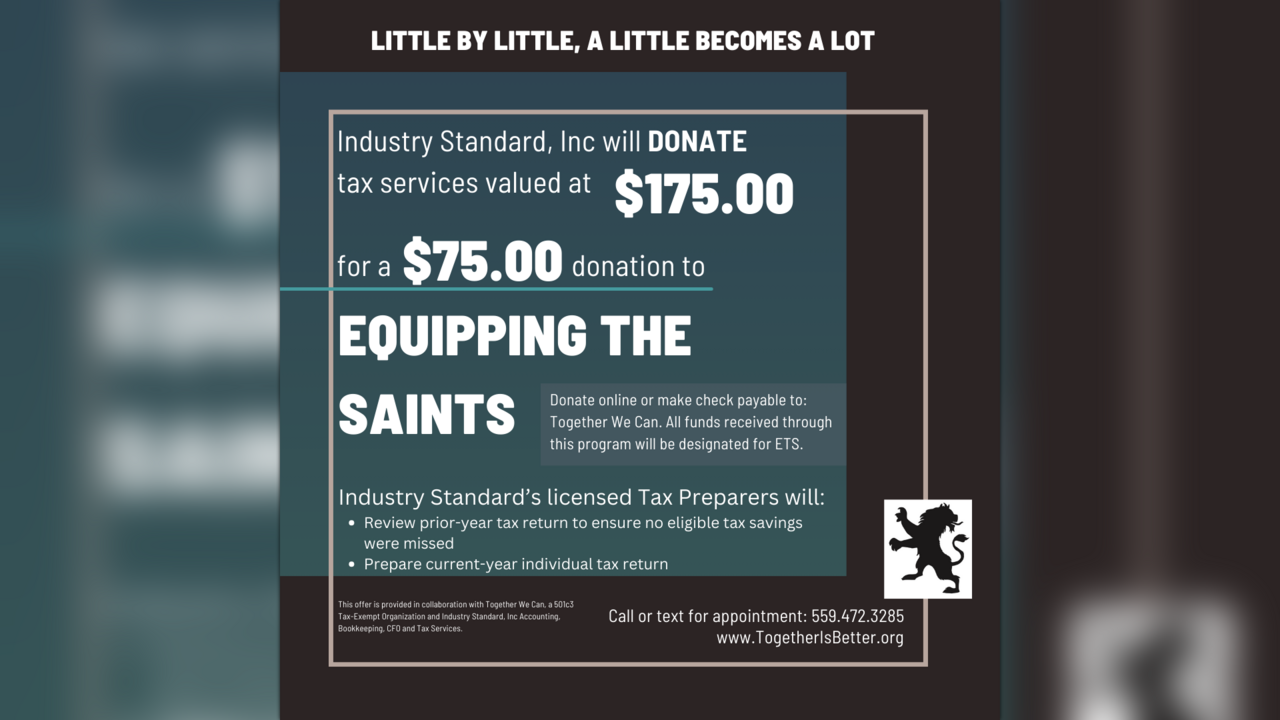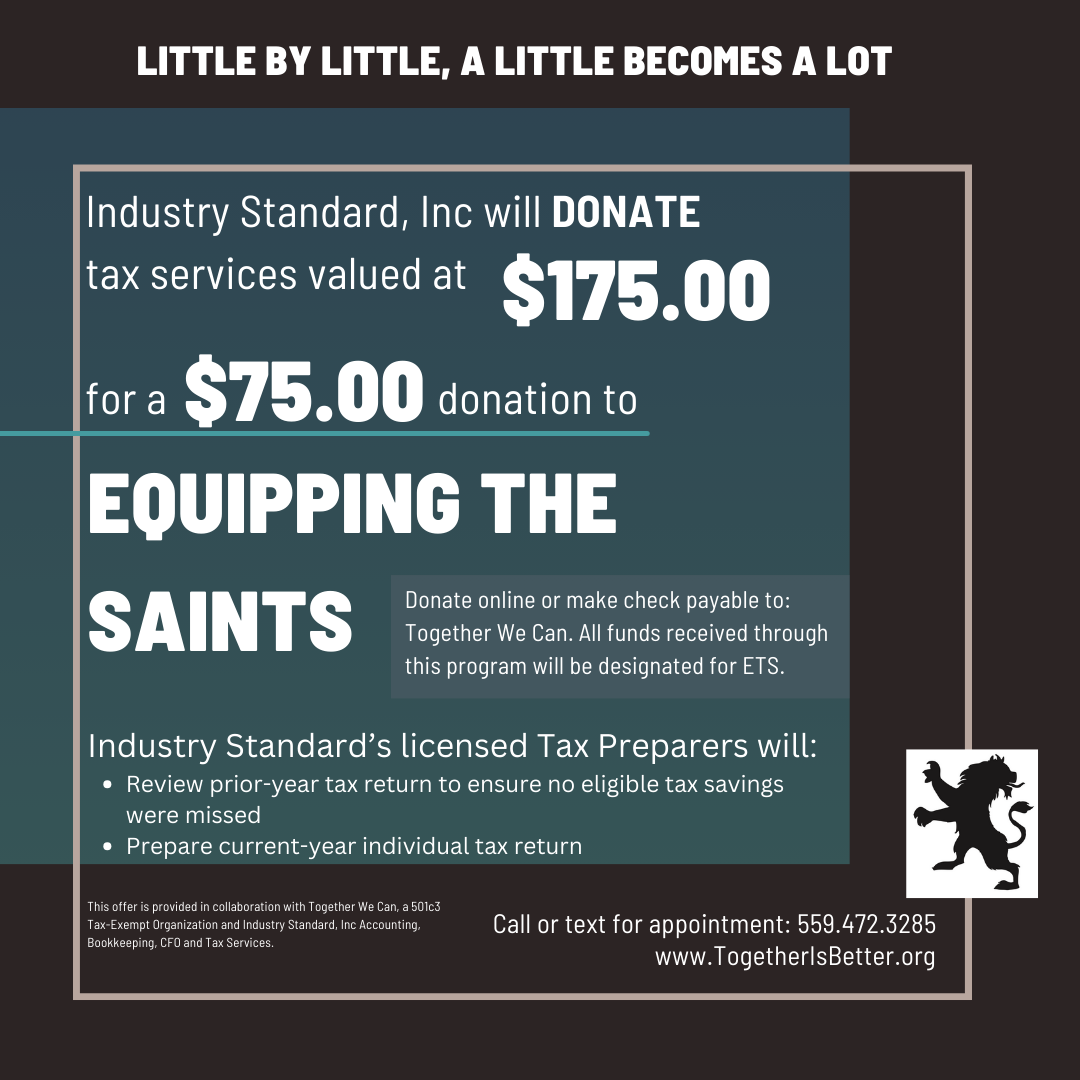 Your donation allows Equipping the Saints to continue its ministries. For a $75 donation to ETS, Industry Standard will donate tax services valued at $175.